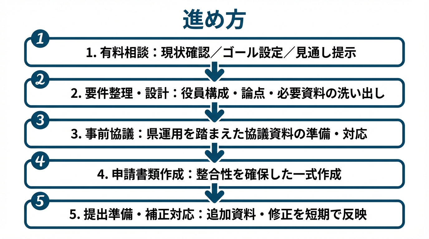 県ごとの運用・審査のポイントを踏まえ、最短ルートの進行計画と提出書類を整えます。